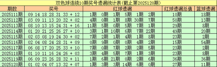 限度双色球第2025120期,最近10期红球遗漏总值分袂为:10期、50期、29期、49期、23期、15期、23期、23期、36期、27期,上期遗漏总期数偏高。